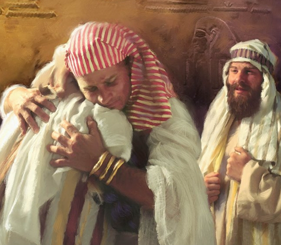 Joseph continued to take his revenge on his brothers by keeping one (Simeon) hostage until they returned with his youngest brother Benjamin. Jacob was very reluctant to allow Benjamin to be taken to Egypt but this was their only hope of obtaining food in a time of famine. Benjamin was greatly loved by his father and, having lost Joseph, Jacob could not bear the thought of losing this child. In today’s reading, we hear Judah (the eldest son) offering himself as hostage instead and making an impassioned plea to Joseph to spare Benjamin; explaining that Jacob’s heart was “so bound up with him” that he would die if anything happened to him. Joseph then relented and revealed his identity to his brothers. The disbelieving brothers took some persuasion that this was indeed the Joseph they had sold into slavery. Joseph assured them that God had a purpose in allowing him to be sent to Egypt and so the reunion of the family began.
